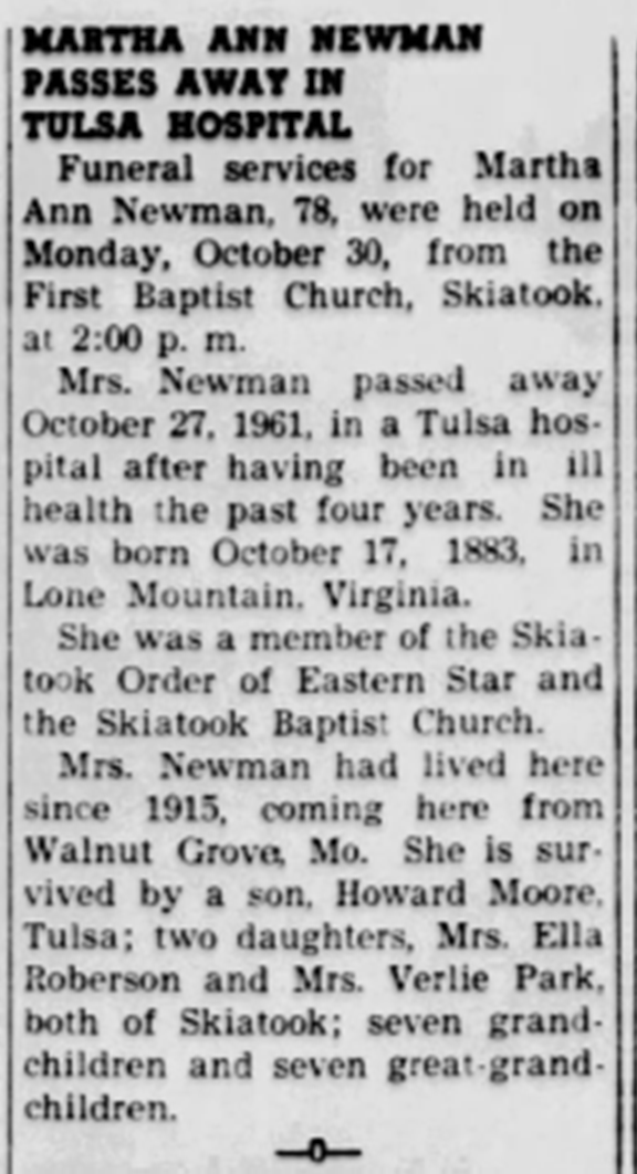 Generation 1 1. MARTHA ANN1 PAYNE was born in Aug 1879 in Springdale, Claiborne, Tennessee. She died on 27 Oct 1961 in Tulsa, Tulsa, Oklahoma. She married (1) SAMUEL S. MOORE, son of Winright Moore and Mary Johnson, about 1896. He was born on 05 Jan 1853 in Lee, Virginia. He died on 01 Dec 1937 in Missouri. She married (2) GEORGE HENRY NEWMAN JR, son of George Henry Newman and Isabella Captain, in 1921 in Oklahoma. He was born on 25 Feb 1883 in Osage, Oklahoma (Near Hominy Falls). He died on 22 May 1950. Martha Ann Payne was buried in Collinsville, Tulsa, Oklahoma (Ridgelawn Cemetery). Samuel S. Moore was buried in Roach, Camden, Missouri (Old Roach Cemetery). Samuel S. Moore and Martha Ann