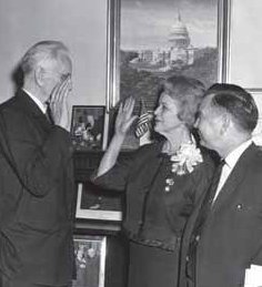 Irene Baker of Tennessee, widow of Howard Baker, Sr., poses for a ceremonial picture of her swearing-in as a U.S. Representative on March 10, 1964. Speaker John McCormack of Massachusetts (left) administers the oath. Looking on is Majority Leader Carl Albert of Oklahoma. Image courtesy of the Howard H. Baker center for public policy