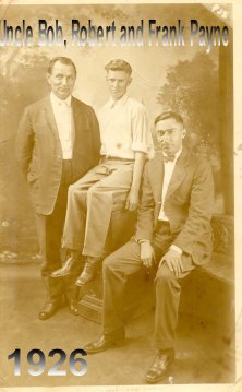 all pictures made in Cincinnati, OH except the one on the far right, which was from a lady who found some old pictures. One with the name of Bob Payne on the back. I noticed that the buttons on the jacket were correct so the picture is facing right. It does bear a likeness to Robert W. Payne as well as the other Payne's but until I find more proof will have to think it may not be. Further down is a picture of Robert W. Payne and his granddaughter Estelle and either Helen or Ethel. More of those pictures can be located HERE