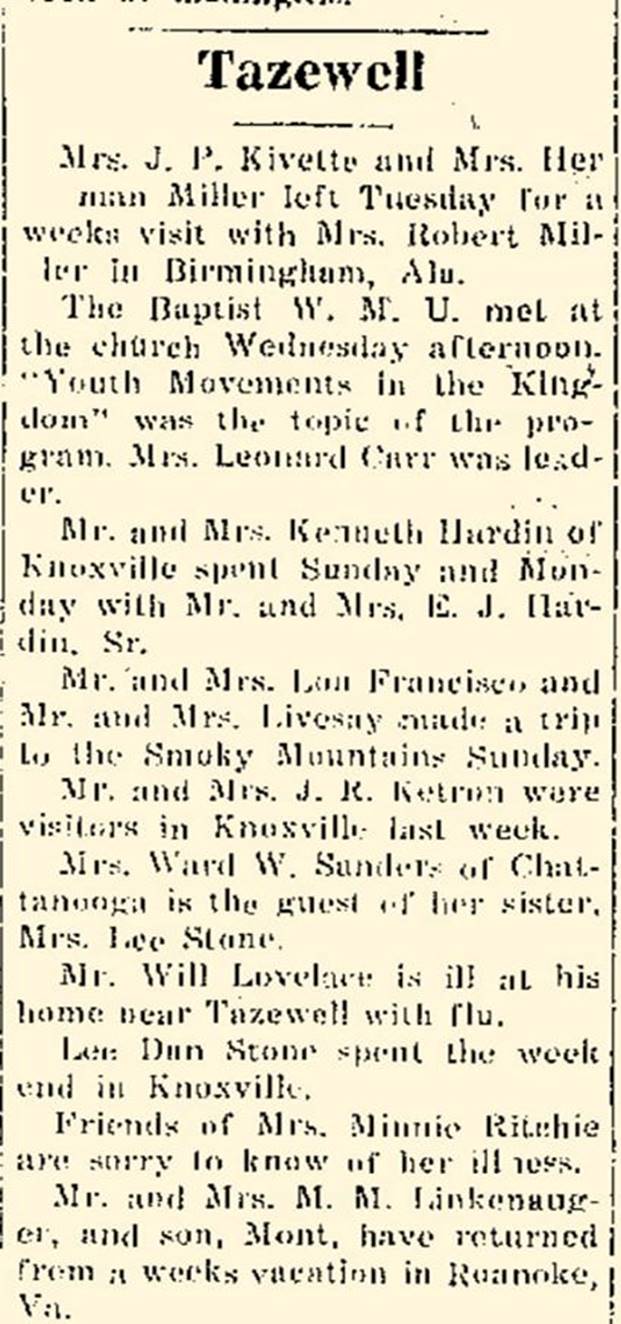 Joe, my father's side of the family were old-time Claiborne Co./Tazewell residents. They were the Margraves and Essarys. My father died several years ago and I