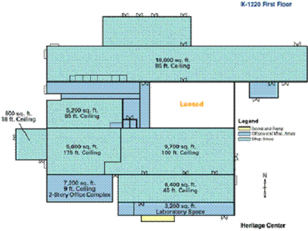 On the right is the K-1220 Centrifuge Plant Demonstration Facility, which was used from 1981 to 1985 primarily to test production centrifuges to be used in the Gas Centrifuge Enrichment Plant and includes high, intermediate and low bay areas. The facility is a steel frame structure on a concrete slab with insulated metal siding enclosing approximately 86,000 ft2 of floor space.Behind K-1220 is K-1210-A, Advanced Equipment Test Facility. This facility was used from 1978 to 1985 to test the reliability of production centrifuges and includes high, intermediate and low bay areas. The facility is a steel frame structure on a concrete slab with insulated metal siding enclosing approximately 24,000 ft2 of floor space.