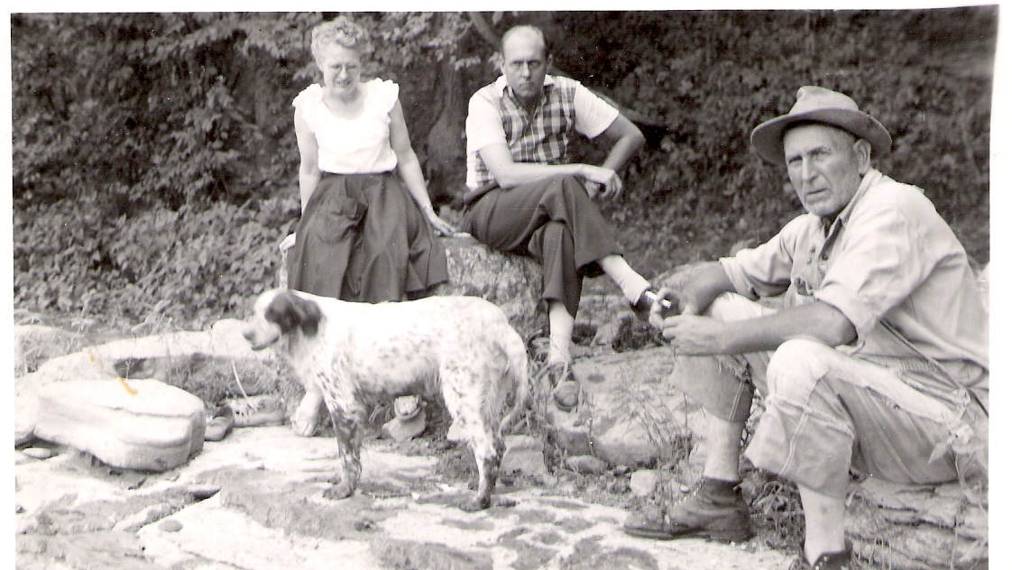 handwritten on the back "Agatha, James and Arthur Campbell in Tenn. Aug. 1952. Agatha and James are my husband's parents.