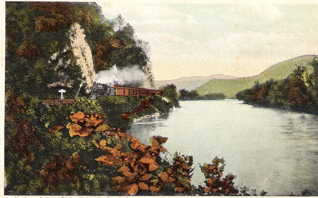 Postcard captioned Southern Railway Train Along the French Broad River Near the Tennessee-North Carolina State Line. blank - no notes.