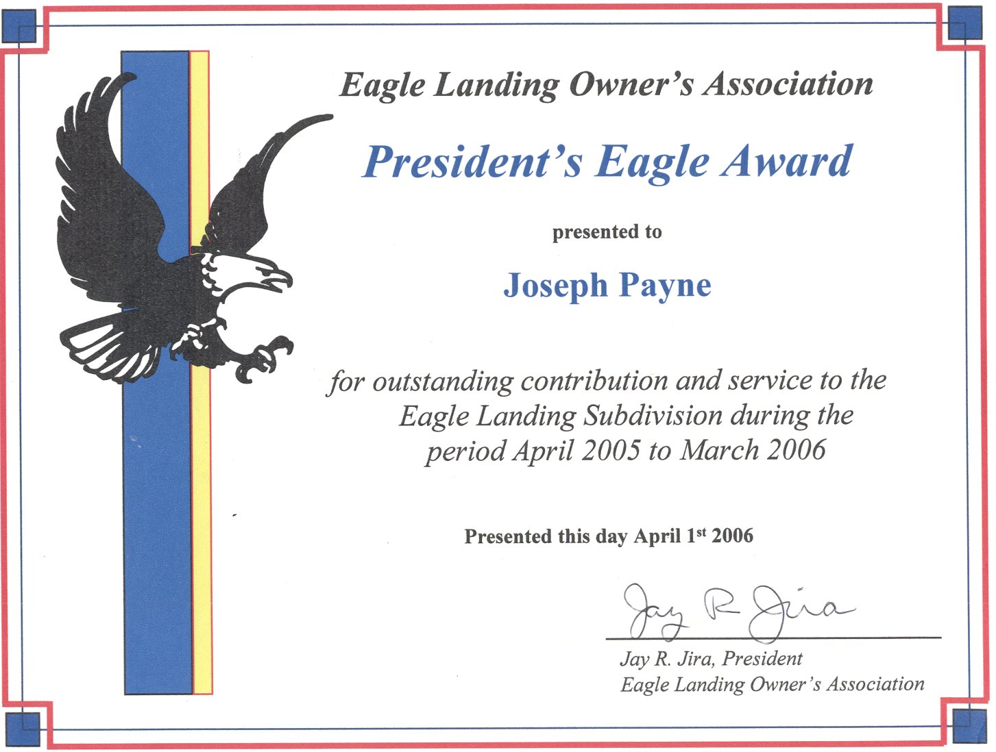 I have arranged contracts for maintenance and helped in securing all necessary permits for building a common area boat-launching ramp and parking area. As vice-president I conducted the business of seeing that each yearly owner’s association meeting was held at the appropriate time and helped with the formation of committees that will conduct the Eagle Landing Home Owners Association business from now on. I sold in September 2007 the last of the land I owned in Eagle Landing and will only serve as a consultant to the association.