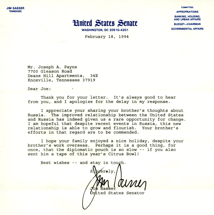 Oh, Senator Sasser and I were such good friends that he was beginning to feel like one of the family as you can see by the above letter. I had been sending my brother tapes of the Tennessee football games by Diplomatic Pouch, which I knew from working there was sorta slow, especially during Christmas. He was referring to the loss to Penn State (1993 CompUSA Citrus Bowl - January 1, 1994 Penn State-31 and Tennessee-13). I think that without a lot of fanfare our great nations can be friends. S Rozhdestvom! and Z Rizdvom Khrystovym!